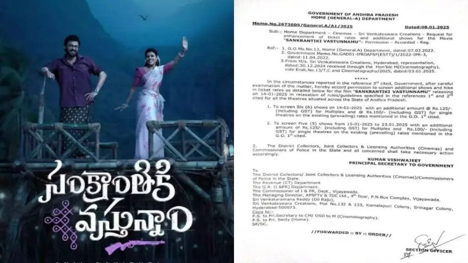ఈ క్రమంలోనే సంక్రాంతికి వస్తున్నాం సినిమా చిత్ర బృందానికి ఏపీ ప్రభుత్వం గుడ్ న్యూస్ చెప్పింది. ఈ సినిమా టికెట్ ధరలను పెంచుకోవడానికి అనుమతి ఇస్తూ ప్రభుత్వం ఉత్తర్వులు జారీ చేసింది.విక్టరీ వెంకటేష్ నటిస్తున్న సంక్రాంతికి వస్తున్నాం సినిమా విడుదల రోజు నుంచి మొదటి పది రోజులు సింగిల్ స్క్రీన్స్లో రూ. 100, ముల్టీప్లెక్స్లో రూ. 125 పెంచుతూ అనుమతులు ఇచ్చింది. ఈ పెంపుతో సంక్రాంతికి వస్తున్నాం టక్కెట్ ధరలు రూ. 245, రూ. 175 రూ. 302గా ఉండనున్నాయి. యంగ్ డైరెక్టర్ అనిల్ రావుపూడి తెరకెక్కించిన ఈ చిత్రం సంక్రాంతి కానుకగా జనవరి 14 న ప్రేక్షకుల ముందుకు రానుంది.